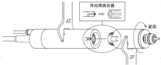 将马达前部的螺丝对准主轴后部的螺丝朝顺时针方向转动。如果旋转传动用离合器未啮合时,与马达连接的螺丝旋转2圈就不能转动,这时,不可用力紧固,将螺丝稍微旋出后用手指转动,使离合器啮合后再拧螺丝,最后用附带的27mm扳手紧固。