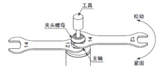 在夹头螺母上套上附带的14mm扳手朝逆时针方向转动,夹头松动后取下工具。(转动约1圈夹头螺母可紧固1次,再次转动后夹头被打开。)