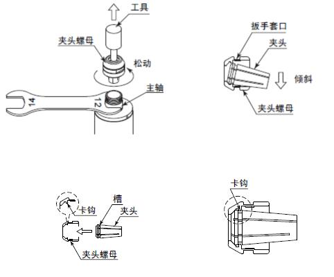 注意:把夹头装到夹头螺母上的时候,请保证使夹头槽准确地进入螺母卡钩。否则在拧紧螺母后,有时夹头会留在主轴内,无法取出。