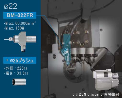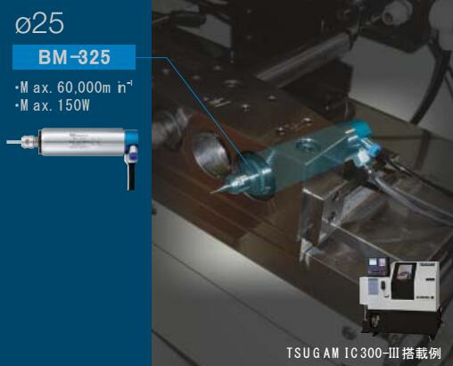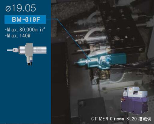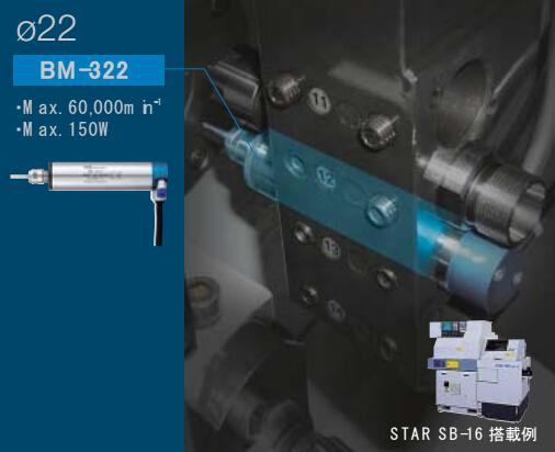 iSpeed3专为精密自动车床开发。主轴全场87.3mm,采用超小型精密控制器单元,马达转速可以100min-1的单位设置,实现微小精密切削加工。高速主轴特点:1.高性能,高效率,高精度。2.采用高精度的陶瓷轴承。3.外径规格有Φ19.05mm,Φ20mm,Φ22mm,Φ25。产品:控制器单元(100V,120V,200V,220V),转速:1000~80000min-1;输出方式:2通道(不可同时运行);最大输出功率:150W;定格消耗电流:0.65A;空气消耗量:30l/min.BM-319F、BM-319、BM-320F、BM-320:主轴转速:80000min-1;最大输出功率:140W;主轴震动精度:1μm以内。BM-322FL/BM-322FR,BM-322、BM-325:主轴转速:60000min-1;最大输出功率:150W;主轴震动精度:1μm以内。