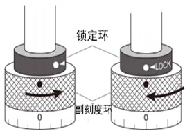 按照图的箭头指示 方向旋转锁定环, 可以设定扭力值 | 锁定扭力值后,锁定环的白点归零位置与副 彩博888刻度环的红点重合就可以固定扭力值。 |