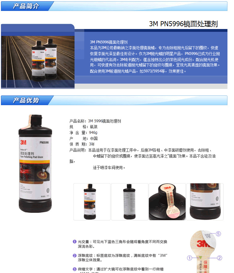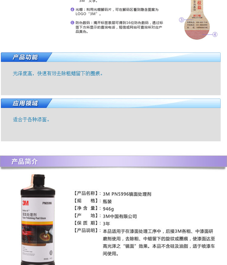 订购:3M PN5996镜面处理剂 划痕修复汽车蜡