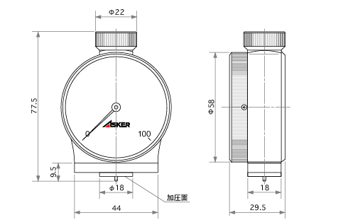 上图所示为橡胶硬度计的种类图, 根据试样的种类设计不同的硬度计. 符合 JIS K 6253标准的A型橡胶硬度计是最普遍最常用的一款.但是通常情况下,测量值在10点~90点之间,使用A型硬度计,A90点以上时使用D型硬度计(硬质材料使用),A20点以下时使用C型或E型硬度计(软质材料使用)。就是说,根据试料的种类选择合适的机型最重要