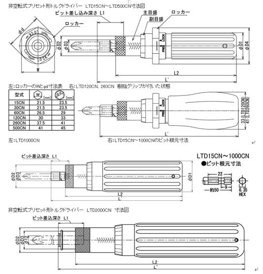 国际单位制型号 | 扭力调整范围[cN.m] | 公制型号 | 扭力调整范围[kfgNaN] | 全长L[mm] | 英制型号 | 扭矩调整范围 [lbf.in] 最小-最大 | ||