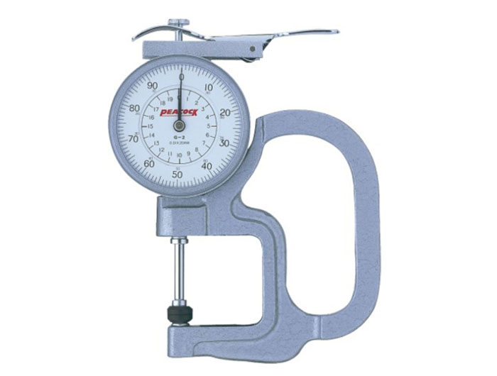 日本孔雀peacock指针式厚度表G-2,测量范围:0-20mm,测量喉深:33mm,专业测量小零件,金属,橡胶,塑料,纸张,铝箔等片状材料的厚度。