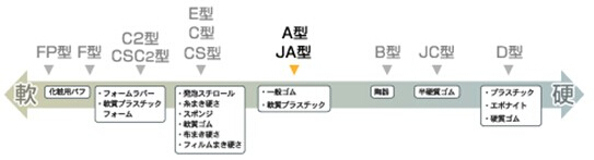上图所示为橡胶硬度计的种类图, 根据试样的种类设计不同的硬度计. 符合 JIS K 6253标准的A型橡胶硬度计是最普遍最常用的一款.但是通常情况下,测量值在10点~90点之间,使用A型硬度计,A90点以上时使用D型硬度计(硬质材料使用),A20点以下时使用C型或E型硬度计(软质材料使用)。就是说,根据试料的种类选择合适的机型最重要。