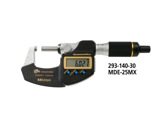 彩博888 日本三丰mitutoyo数显外径千分尺,货号:293-140-30,型号:MDE-25MX,QuantuMike (快进千分尺),IP65防冷却液等级,进给速度达到2mm/rev,测量范围0-25mm,分辨力0.001mm。单手握持即可在同一测量时间内实现6步测量,与传统千分尺相比,定位时间和测量时间可分别降低60%和35%。