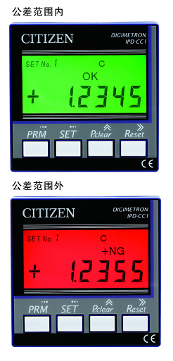 根据设定值,液晶屏幕会在绿色(OK)和红色(NG)之间跳动,在很远的地方就可以了解公差判定结果。
